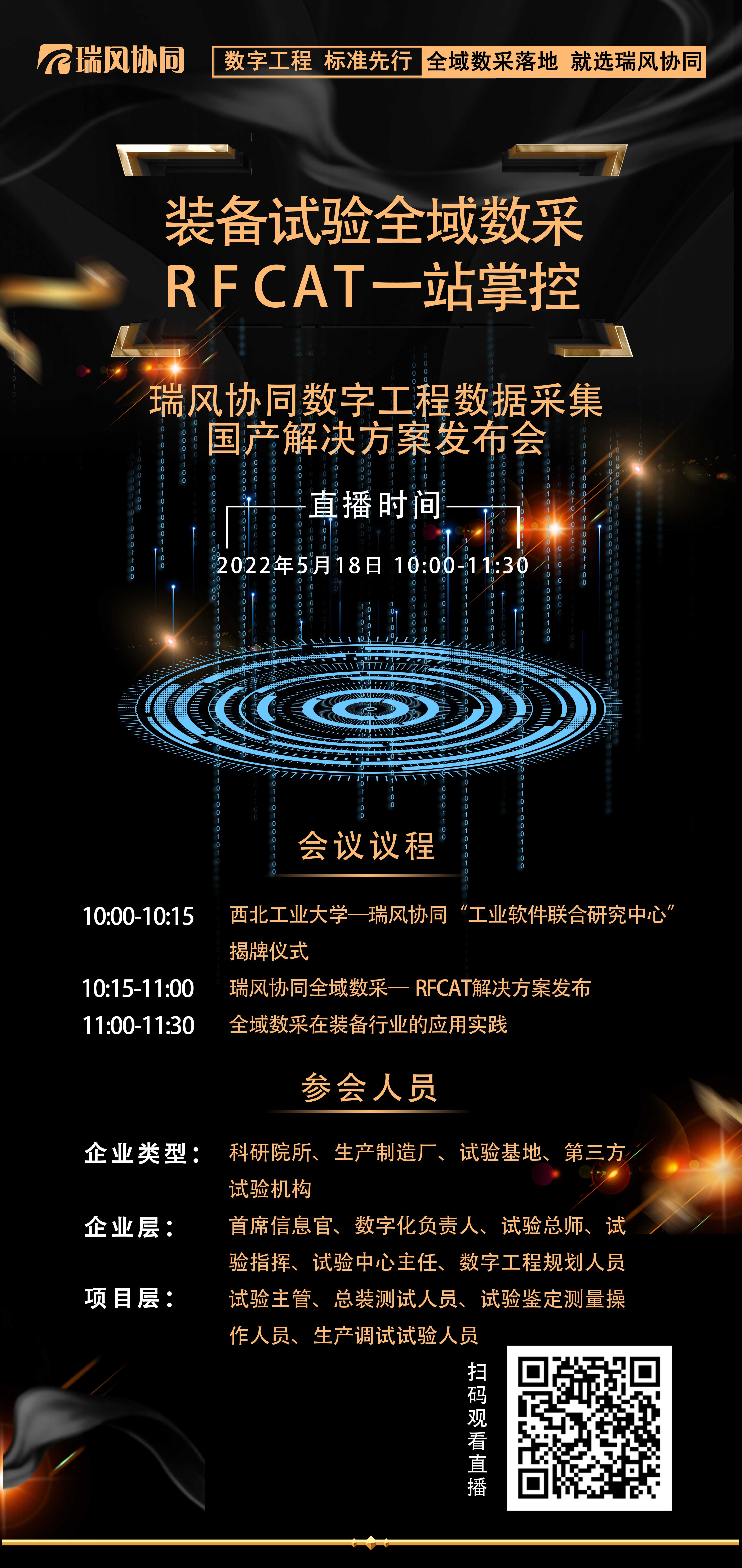 5月18日,瑞风协同隆重推出装备试验全域数采“RFCAT”一站掌控 ——瑞风协同数字工程数据采集国产解决方案,欢迎各位嘉宾莅临直播间参加线上发布会。